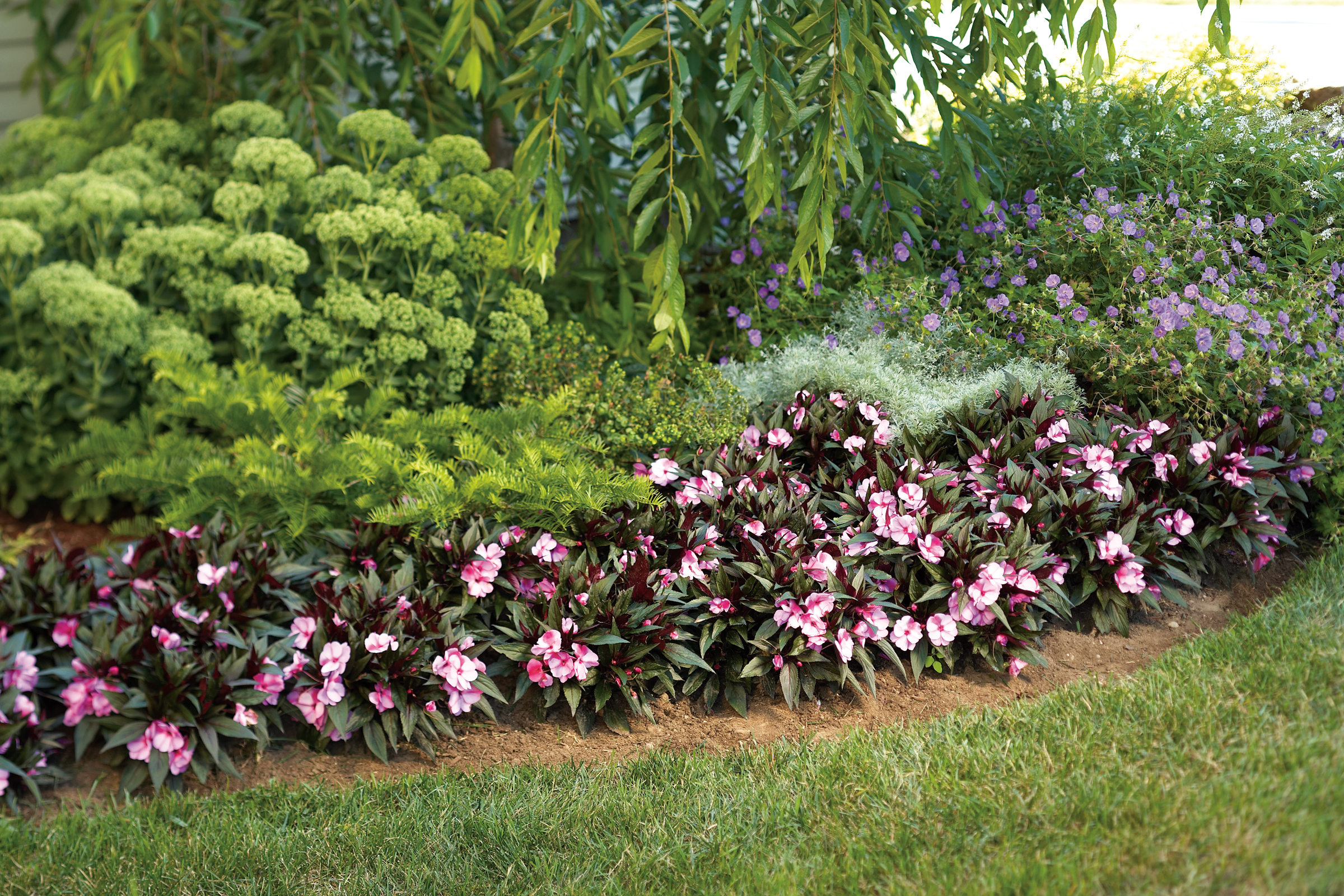 Infinity Pink Frost New Guinea Impatiens line a shady flower bed.