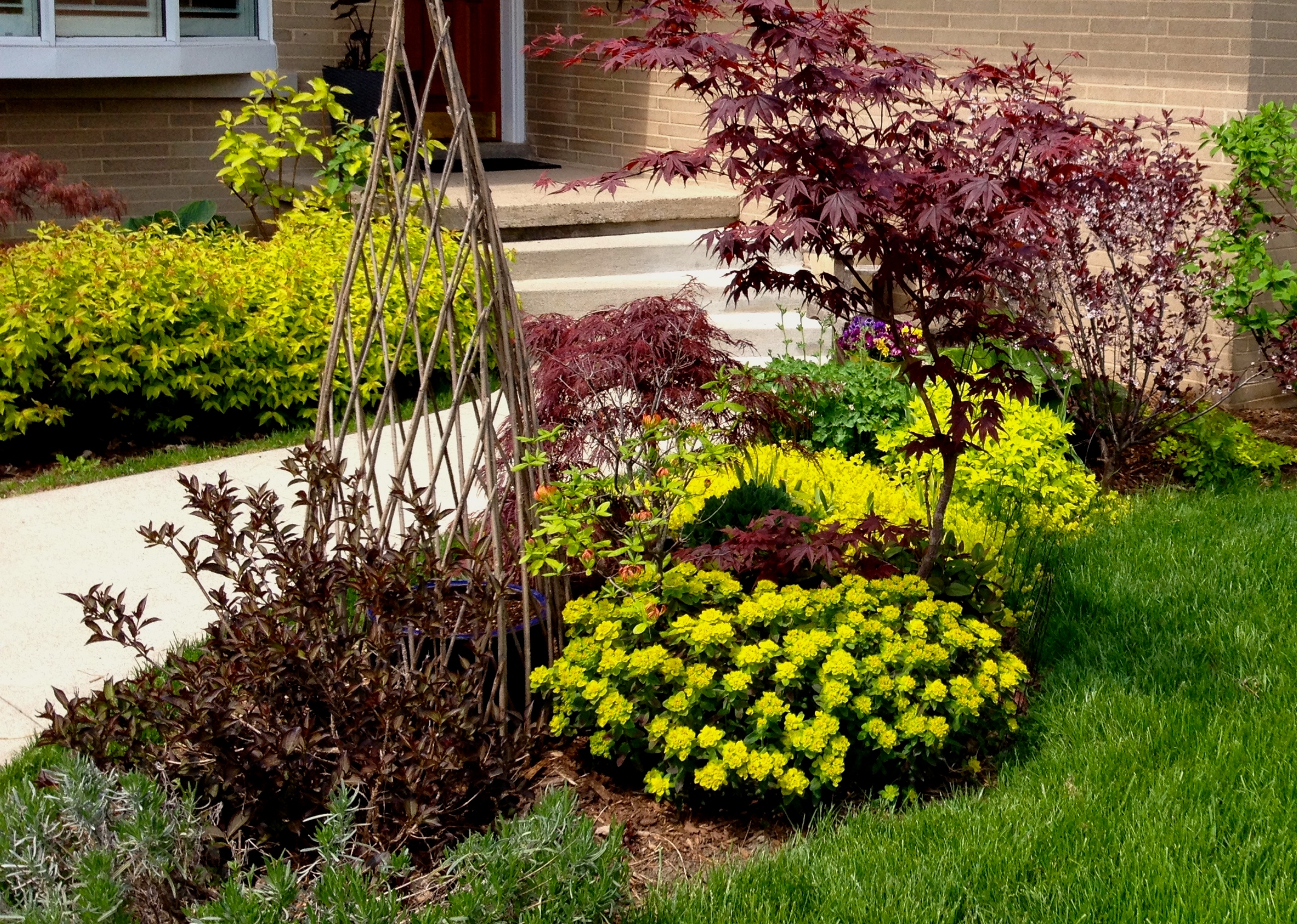 In a new bed, you can break the two-colour rule whenever you want and the results will still look great. Another colour added to the mix instantly becomes an accent because it’ll stand out. In the photo above, you can see the just-about-to-bloom azalea with its orange-coloured flowers.