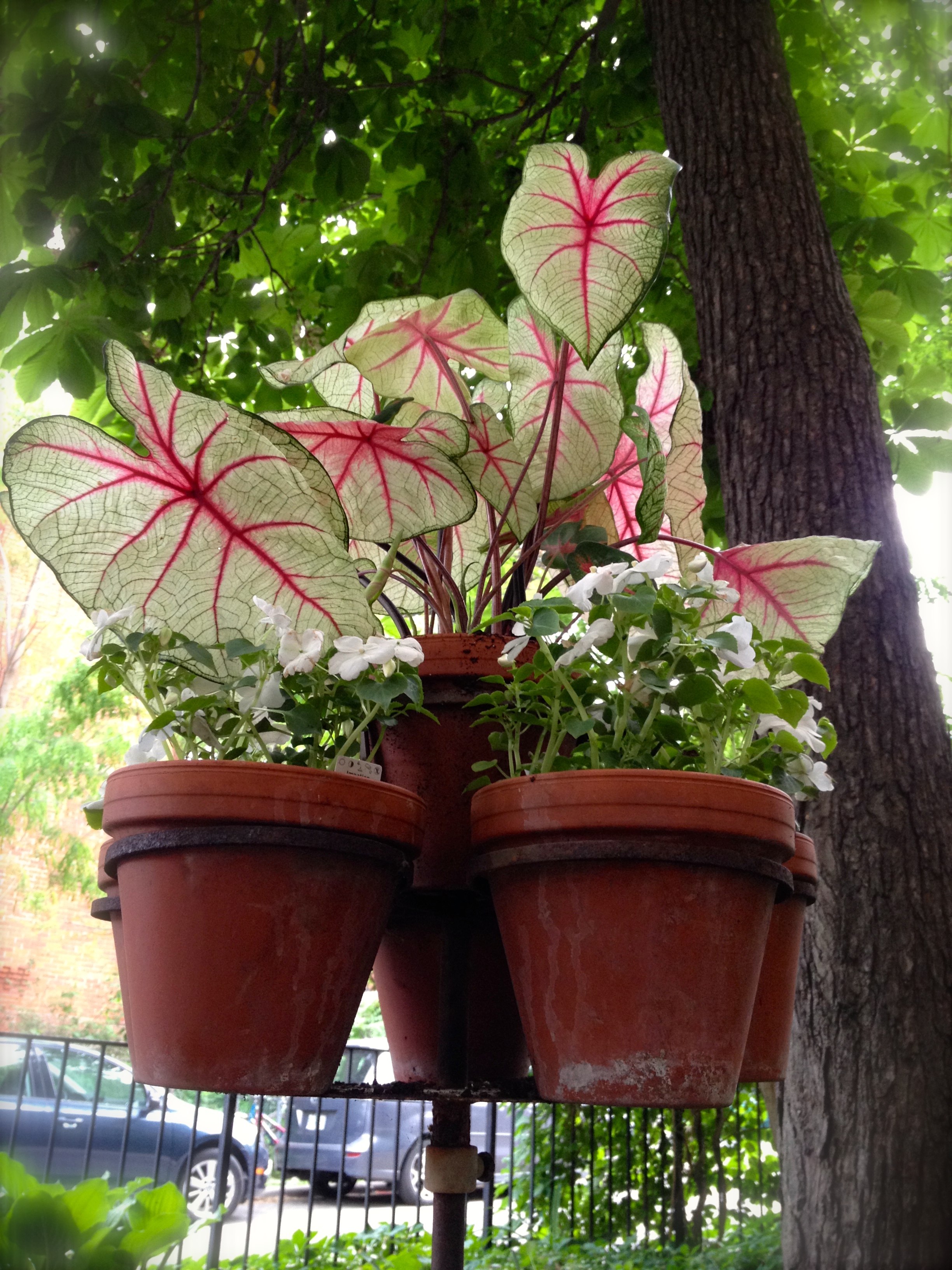 Pink and white leaved plants in pots are placed high overhead near a sidewalk.