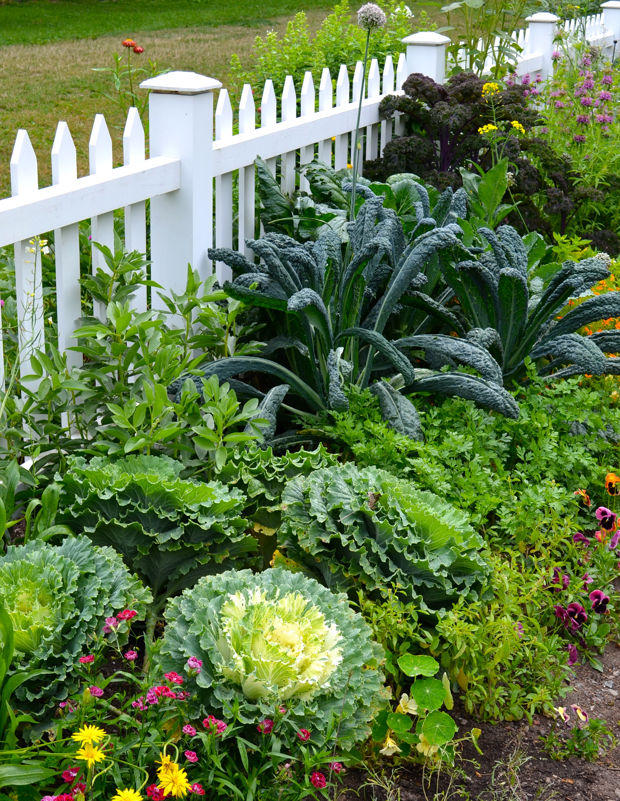 Ornamental cabbage flank a cluster of Dinosaur Kale.