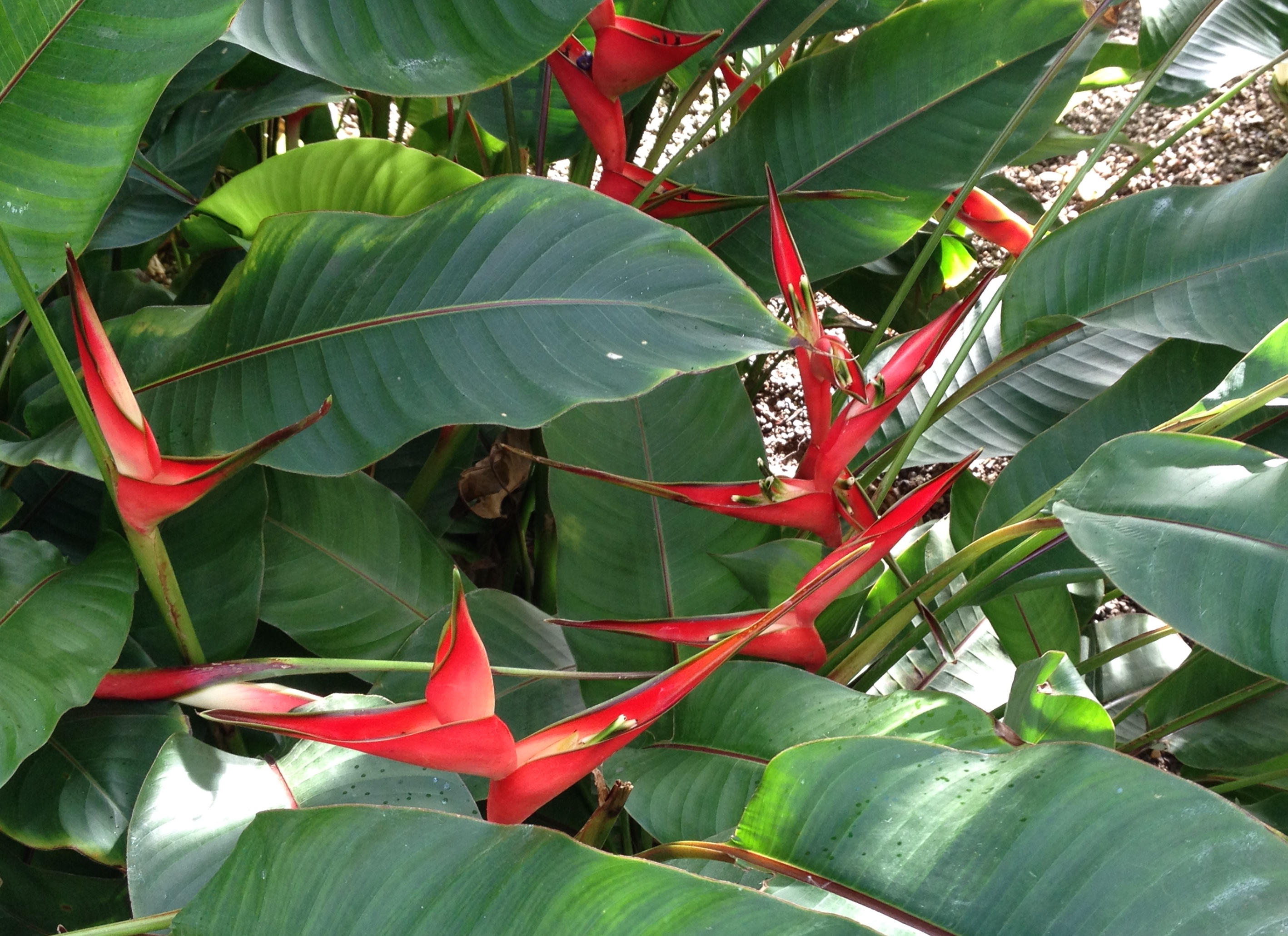 I’m pretty sure this is a Heliconia though it looks more like a flock of scarlet birds in full flight.