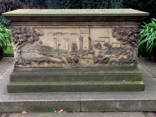 A stone tomb is covered in carvings that include trees, shells and a crocodile.