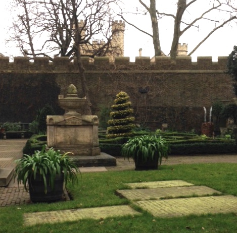 The Knot Garden with Lambeth Palace in the distance. The tomb topped with a carving of a breadfruit is the final resting place of Captain Bligh (he of the H.M.S. Bounty).