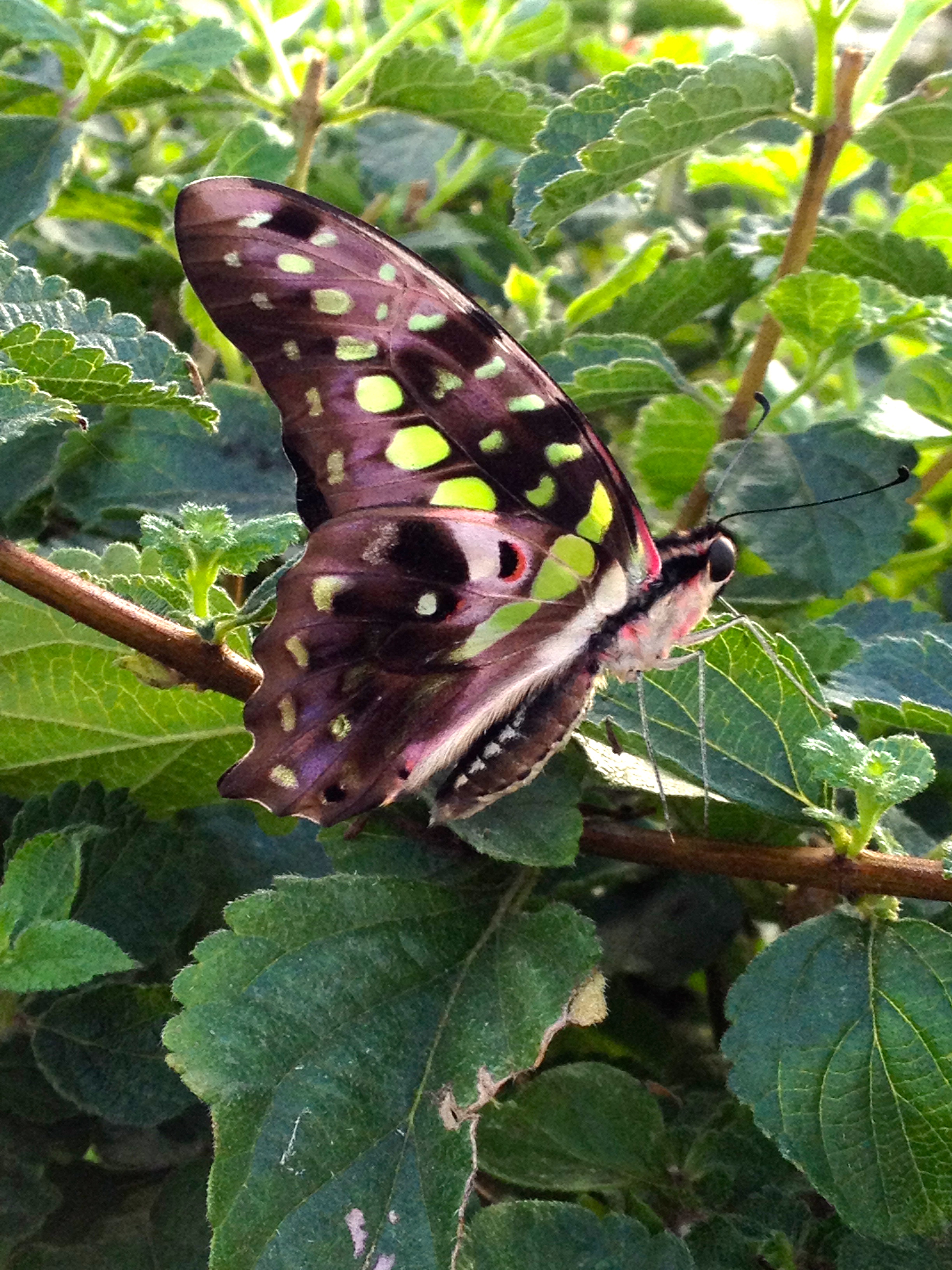 A large brown butterfly or moth with lime green spots.
