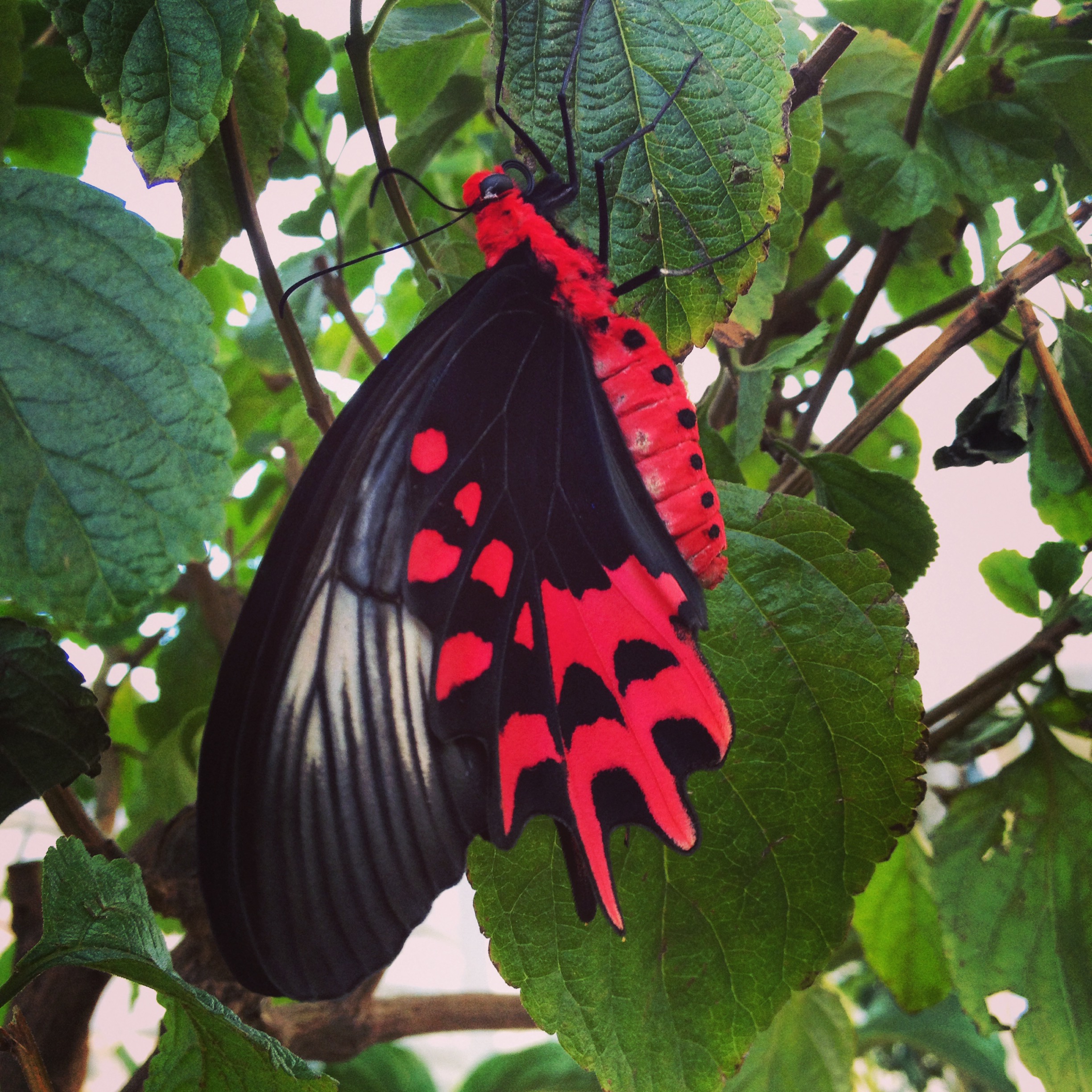 A butterfly with black and bright red markings.
