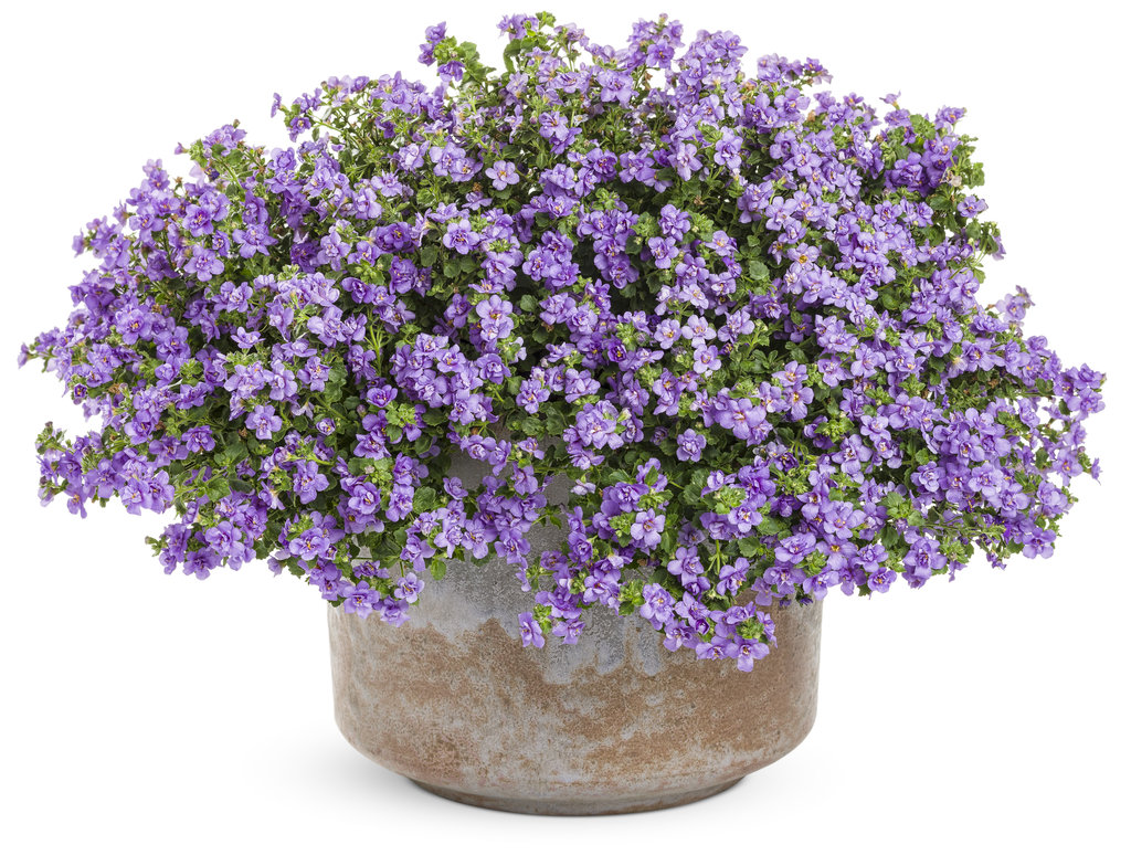 A clay pot is filled with a mounding plant covered in small, double purple blooms.