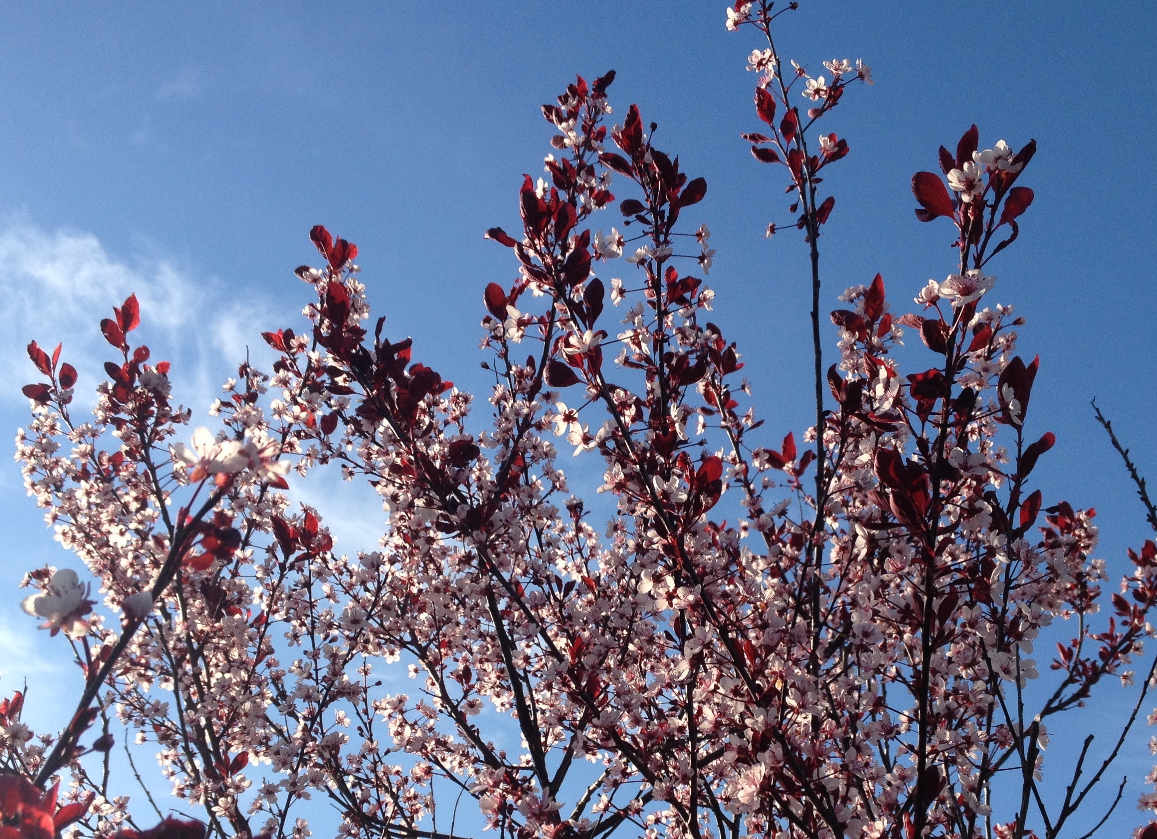 Set against a garden busting out all over in buds and leaves, our Sand Cherry shrubs (Prunus x cistena) stand out with particular elegance. For a nice show of wine-coloured leaves all season long, these shrubs are reliable and, quite frankly, a lovely relief from all that enthusiastic green-ness a shrubby garden can have. And then there are the blossoms–as close to a real cherry blossom as I’ll ever get but I’m quite okay with that.