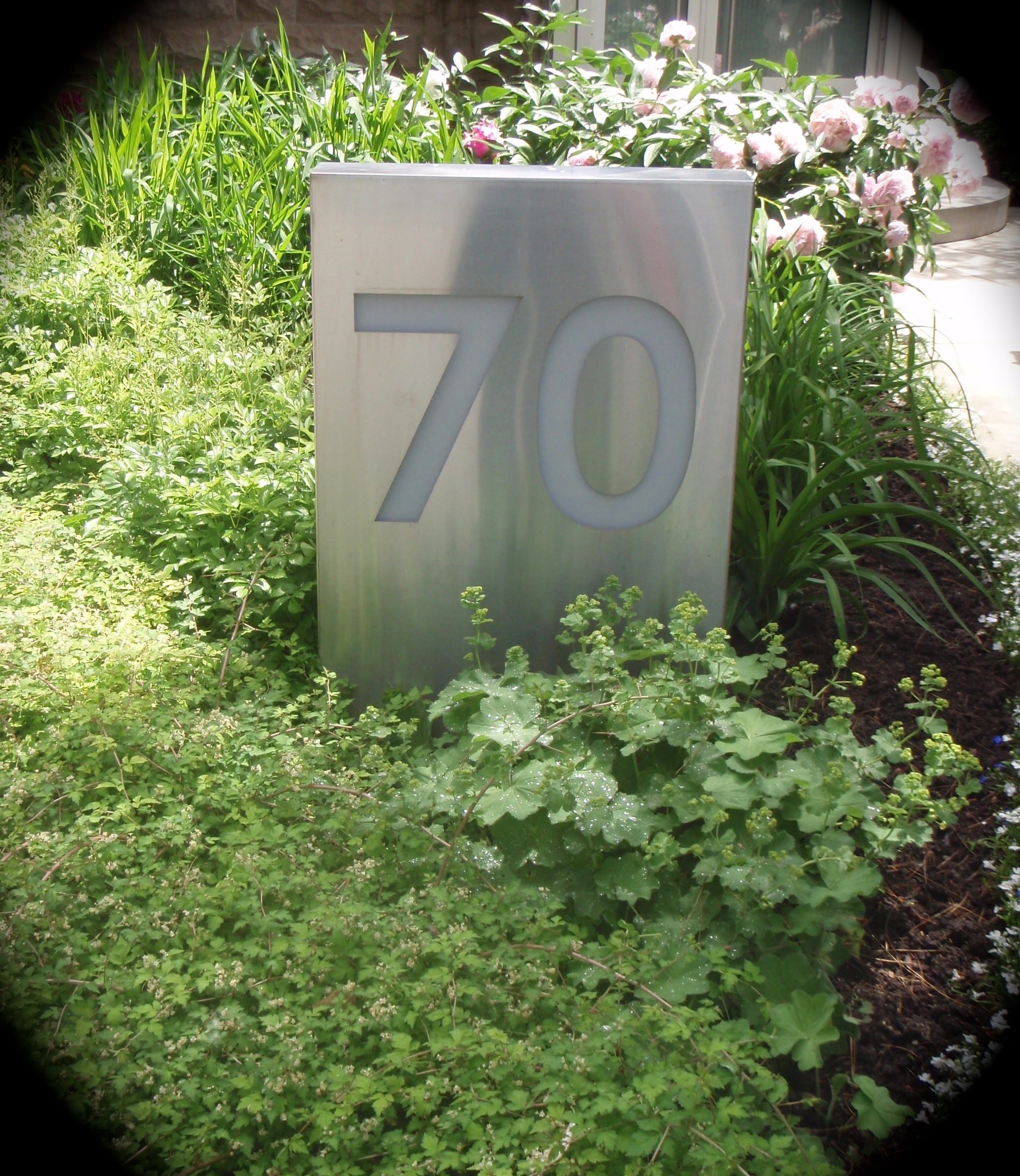 A metal light is used as a house number sign.