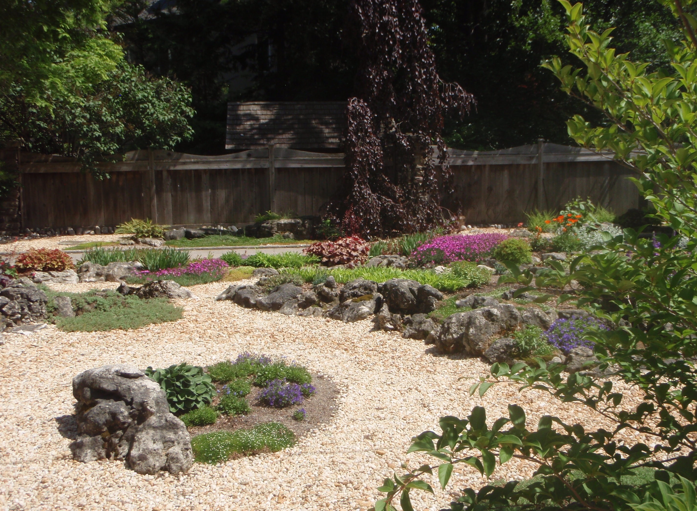 Another view of the front yard, looking across towards the driveway. The front of the house is to the right of the photo. You can see the variety of rocks and plants used as much for texture as for colour.