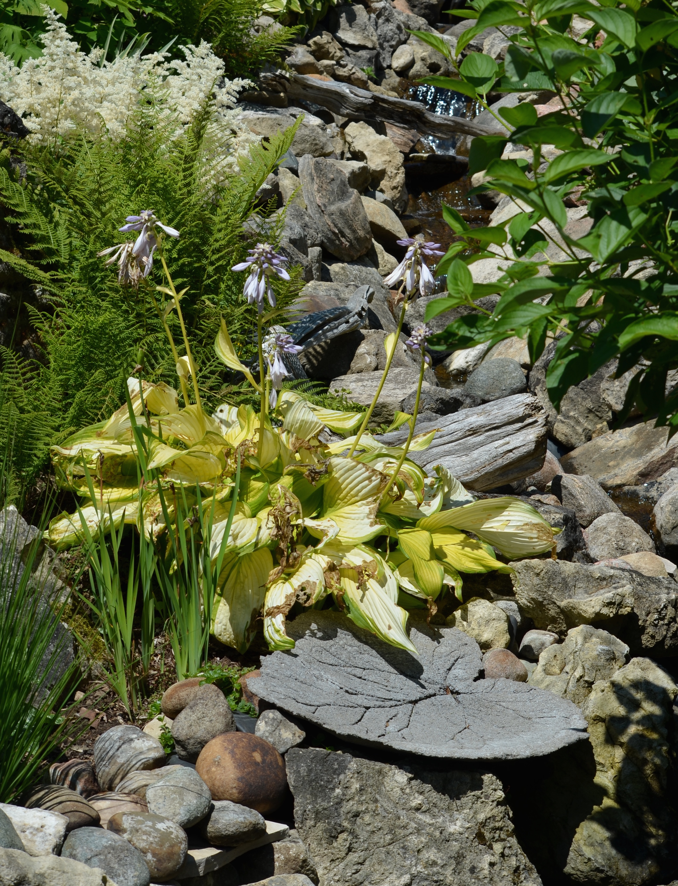 Pieces of wood, rocks and plants make the water feature look almost as if it had always been there. This view is looking up from the base of the water feature.