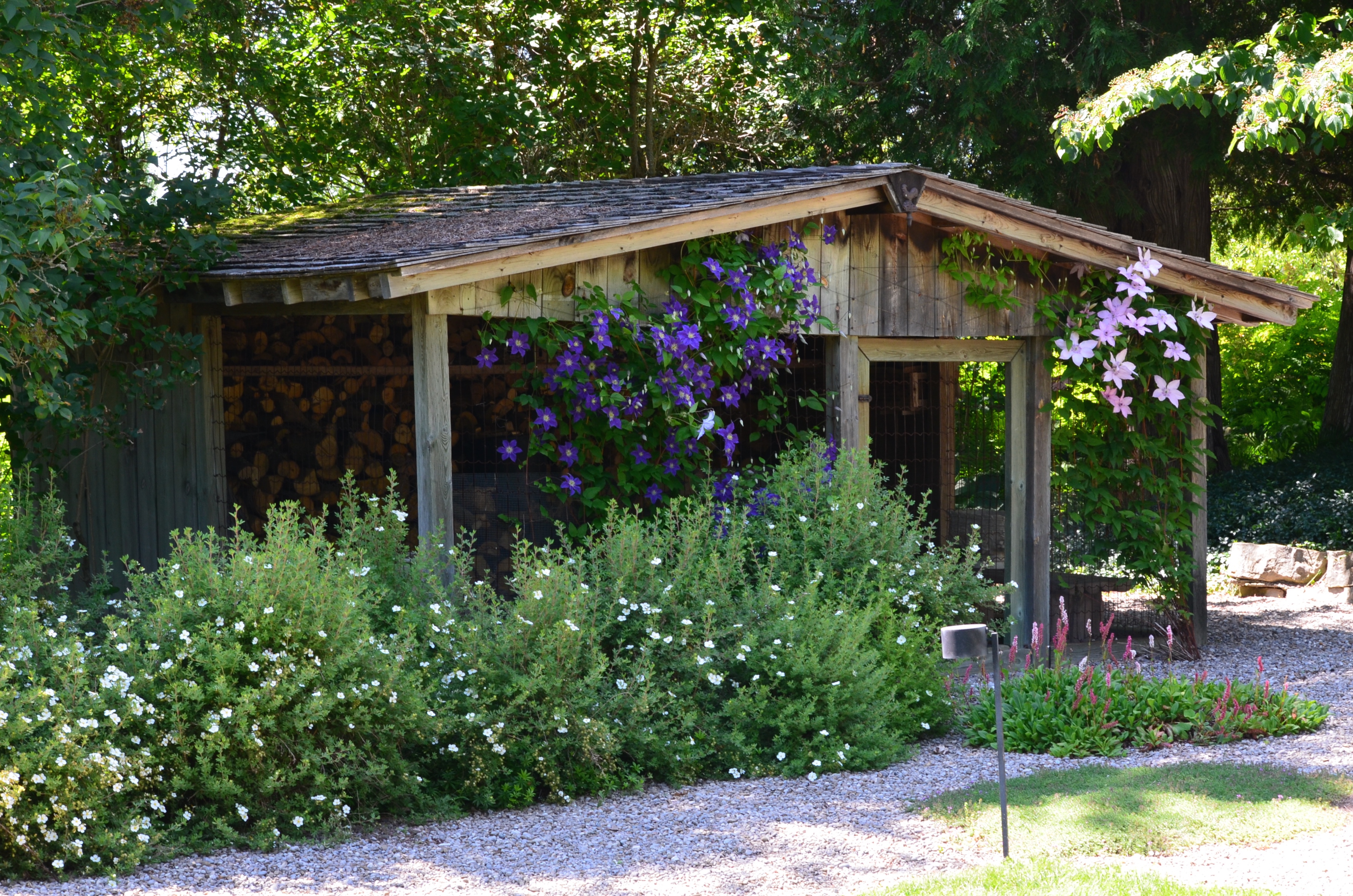 A large open air shelter for wood is covered on one side by a purple clematis.