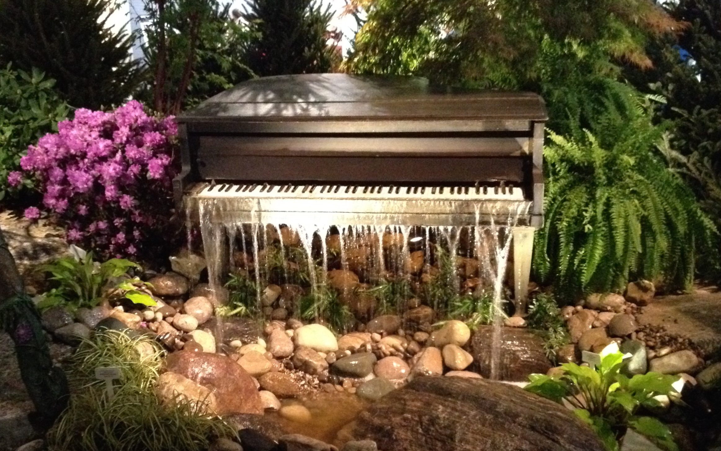 “A Secret Garden Party” designed by Near North Hardscapes Ltd. & Landscape Designs by Jodie Munshaw includes a piano fountain. And why not?