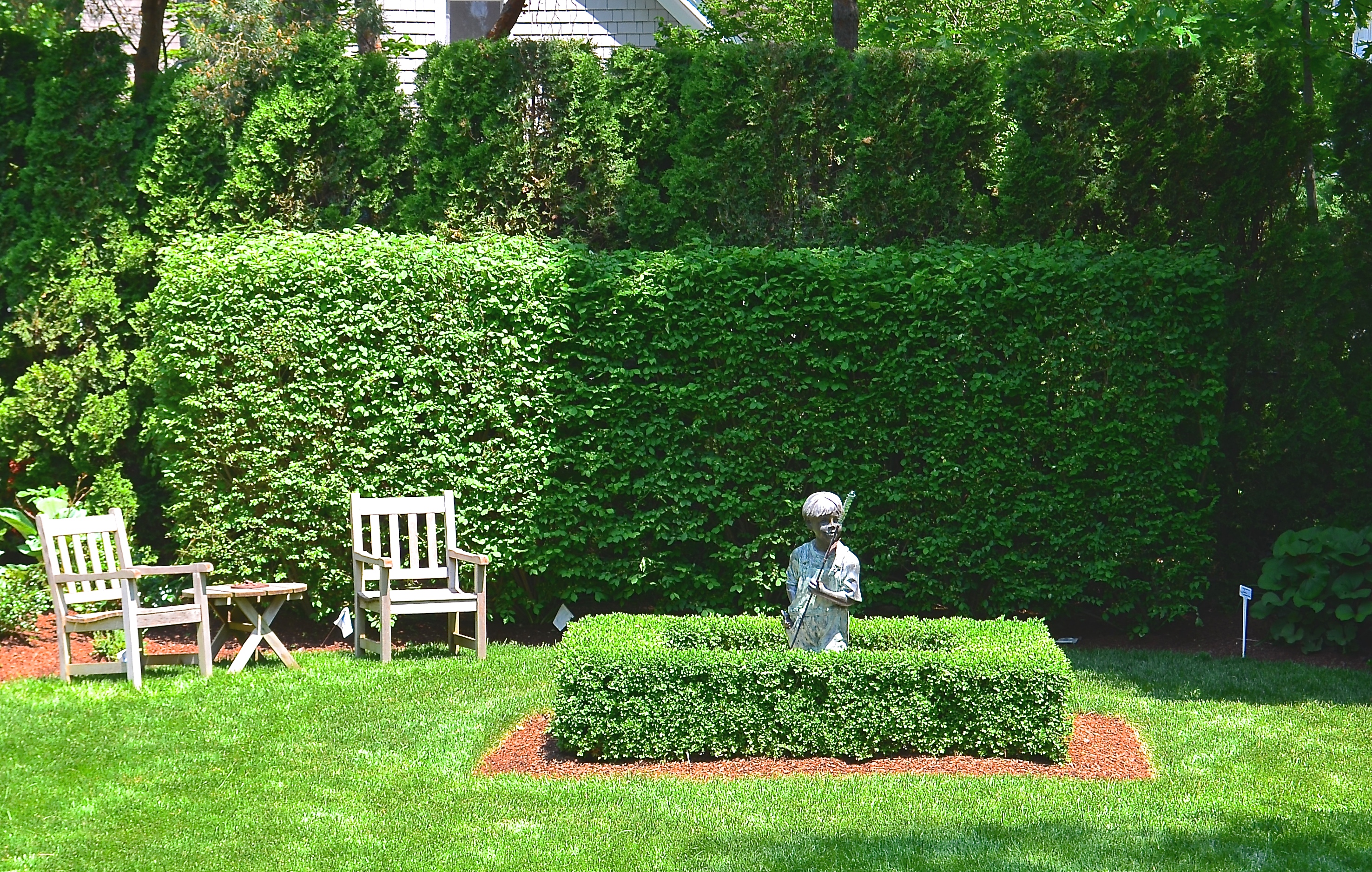 When you don’t have a lot of space but want to create big impact, this is a great idea. Just like a decorative panel or trellis, the smaller hedge in front takes up little space (it’s only about 2 feet in depth) but creates a dramatic frame and adds extra texture while keeping with the formal theme of the garden.
