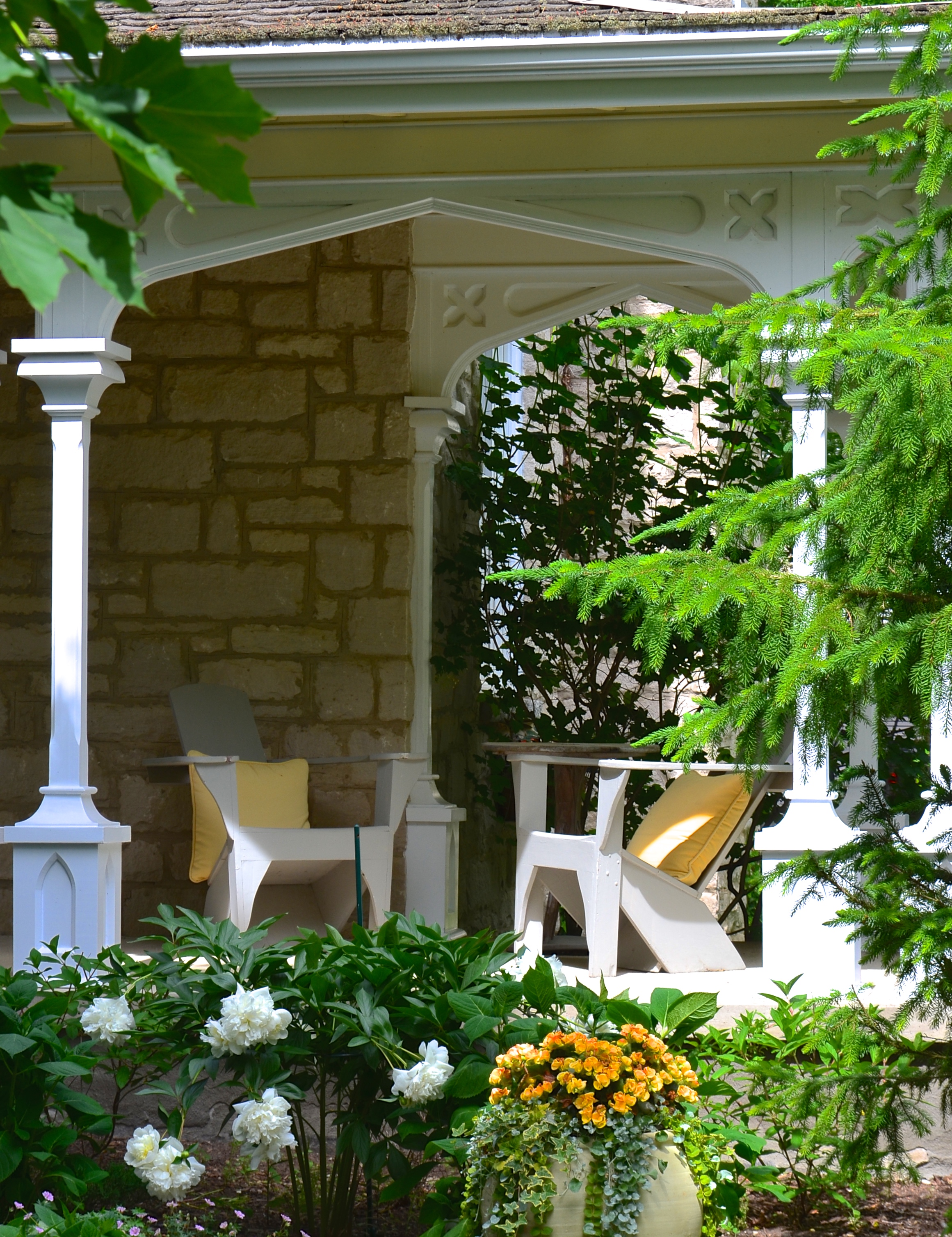 One corner of a long porch spanning the width of a grand home shelters two wooden garden chairs with yellow pillows that complement the garden. Shot on a Toronto Botanical Garden tour near Creemore, ON, in June, 2016.