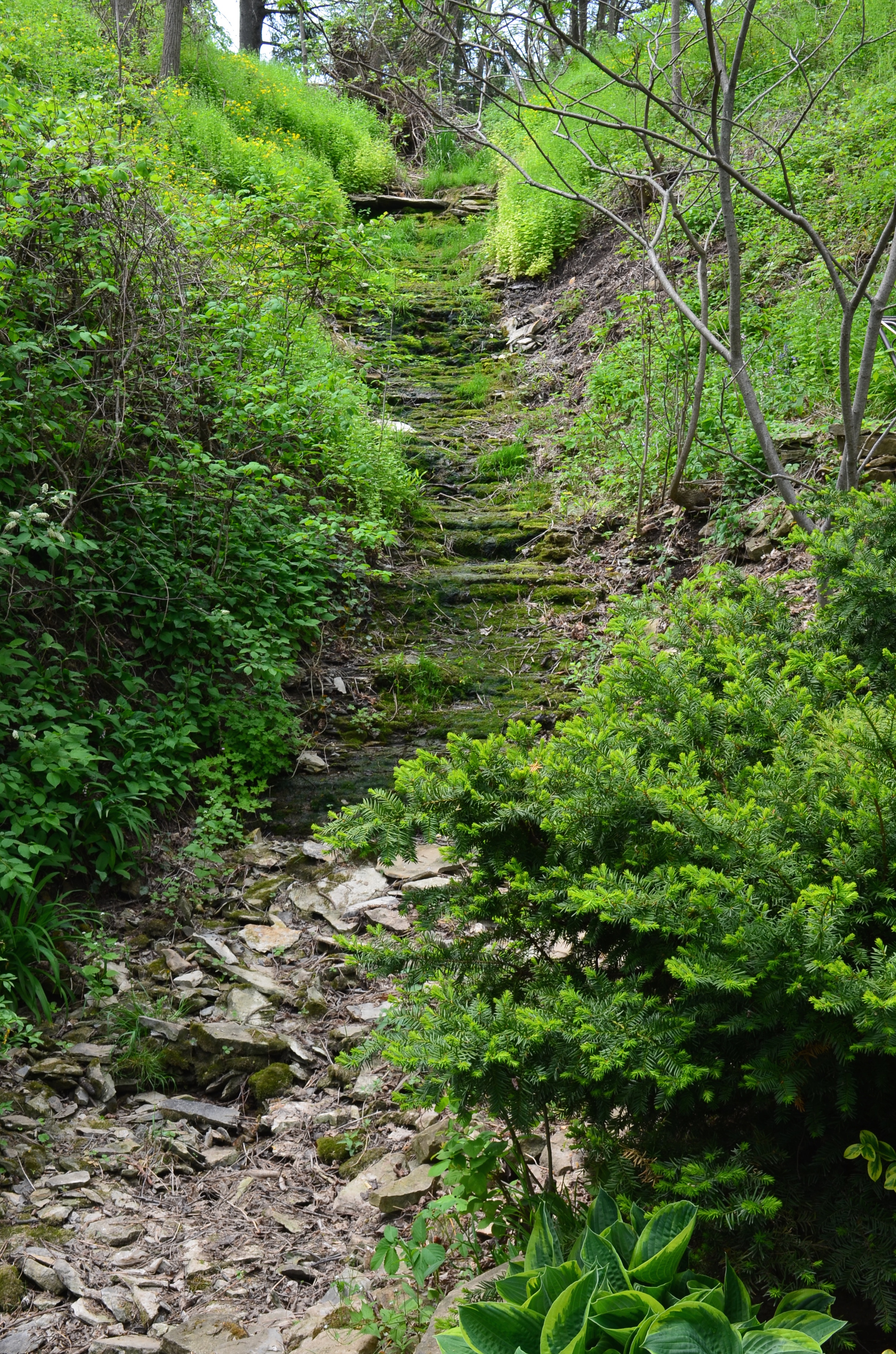 A close-up of the former creek and waterfall. Shot during a Toronto Botanical Garden tour in southwestern Ontario, May, 2016.