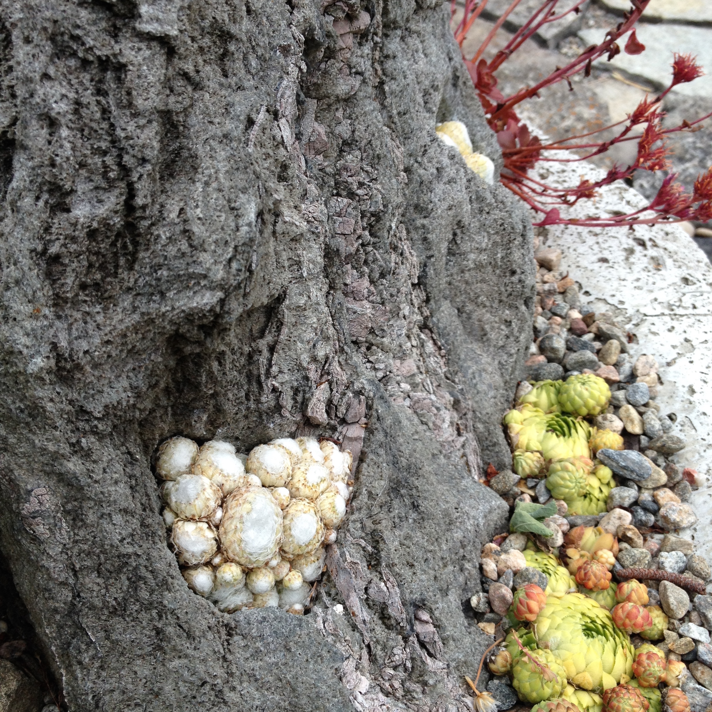 This grouping of different coloured succulents are growing on a tall rock that was placed in a large, shallow cement container. The overall effect, when seen close up, is of an underwater scene.