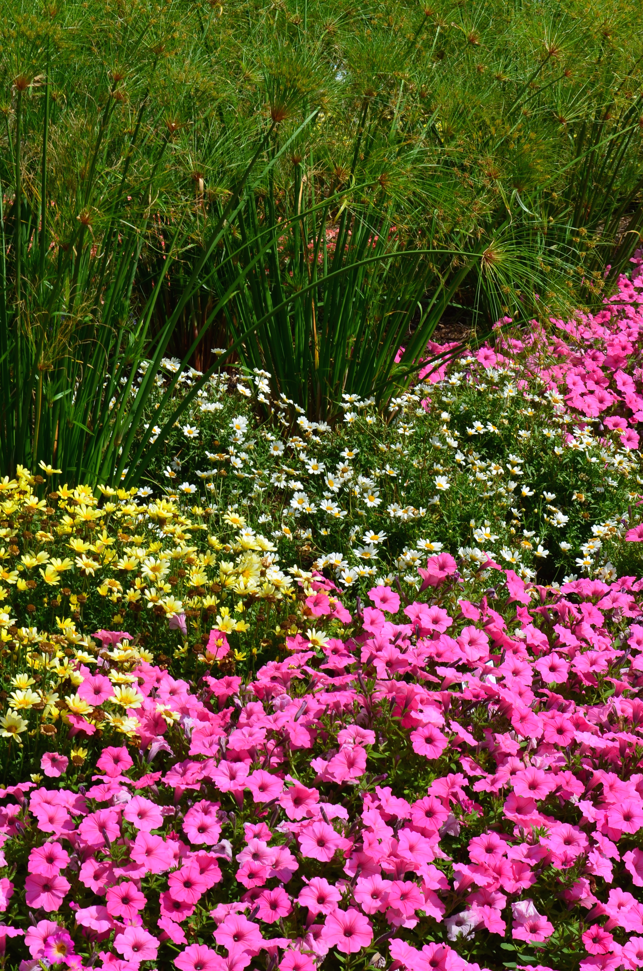 This bed of Supertunia Vista Bubblegum petunias contrasts with groups of Argyranthemum, including Butterfly (yellow flowers), all from Proven Winners.