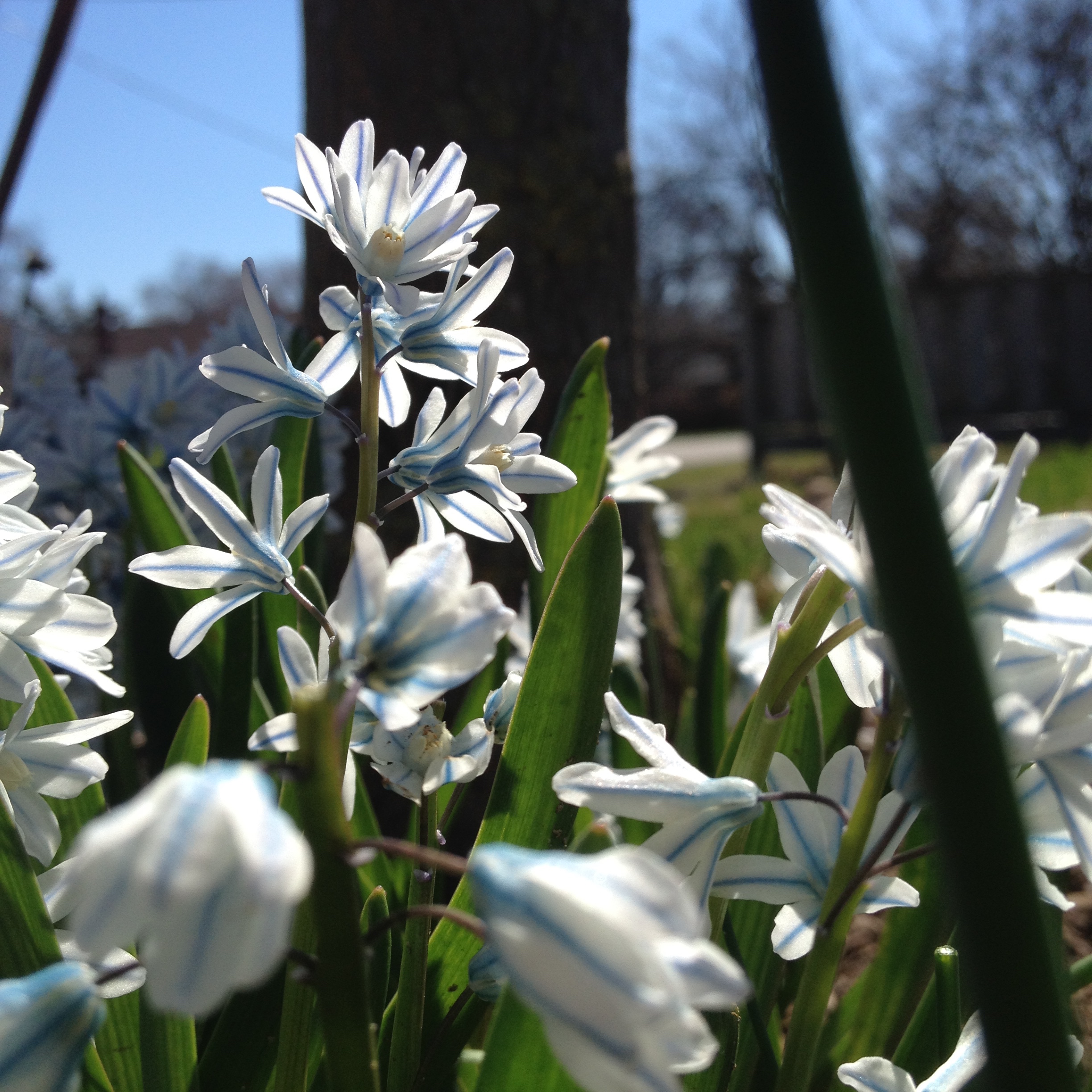 The photo below is of my little patch of Puschkinia scilloides var. libanotica, more commonly known as Puschkinia or Striped squill. It’s not invasive. At least not yet. (More on the sticky issues of invasiveness in an upcoming post. Stay tuned.) As a relative of Siberian squill, Puschkinia shares the same size and flower shape but not Siberian squill’s all-over blue colouring. Instead, Puschikinia is white with a single strong true blue stripe running down each petal.
