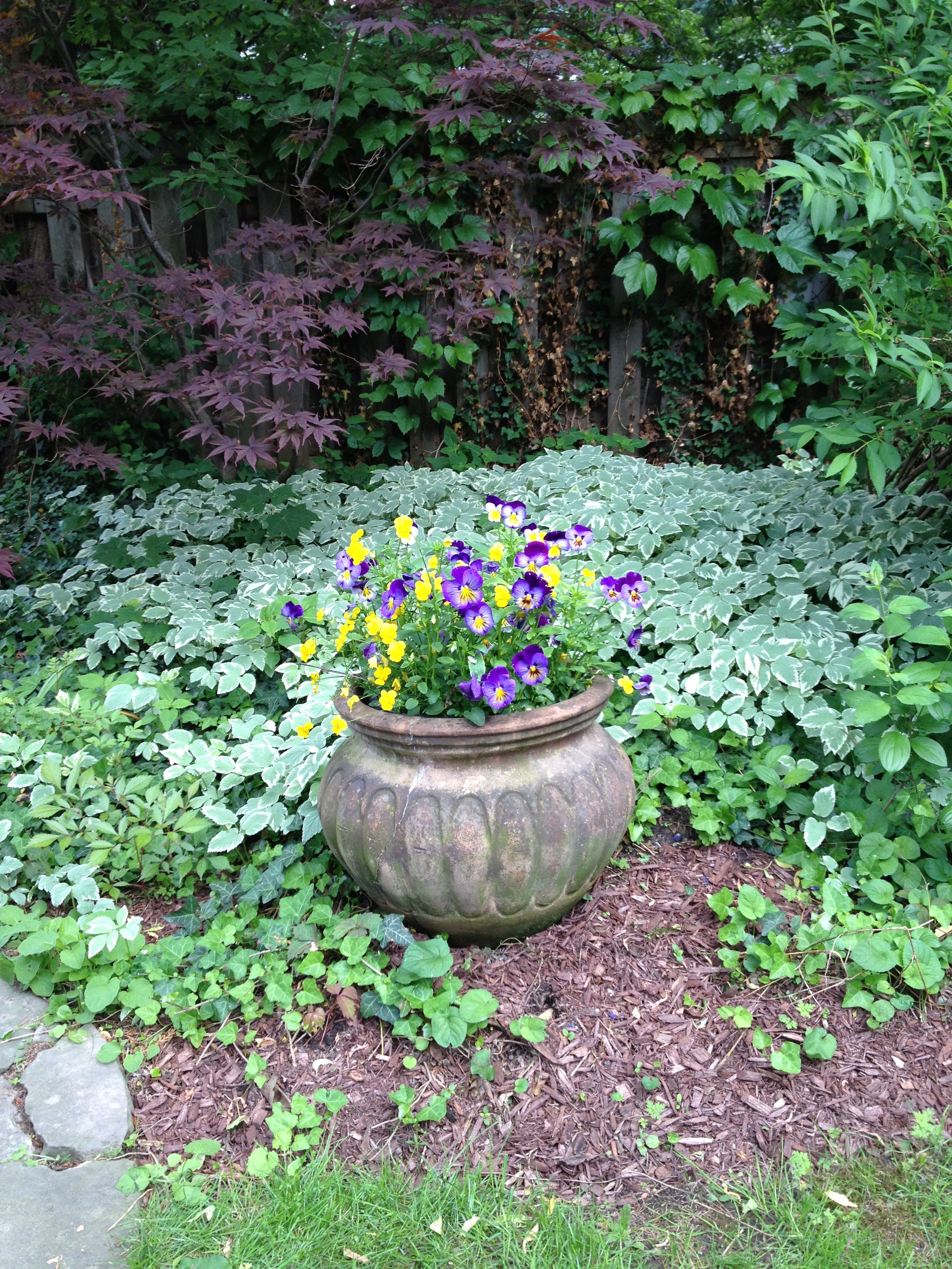 English ivy and Goutweed (both officially invasive species) used ornamentally in an urban garden, part of the Toronto Botanical Gardens tour in June, 2014.