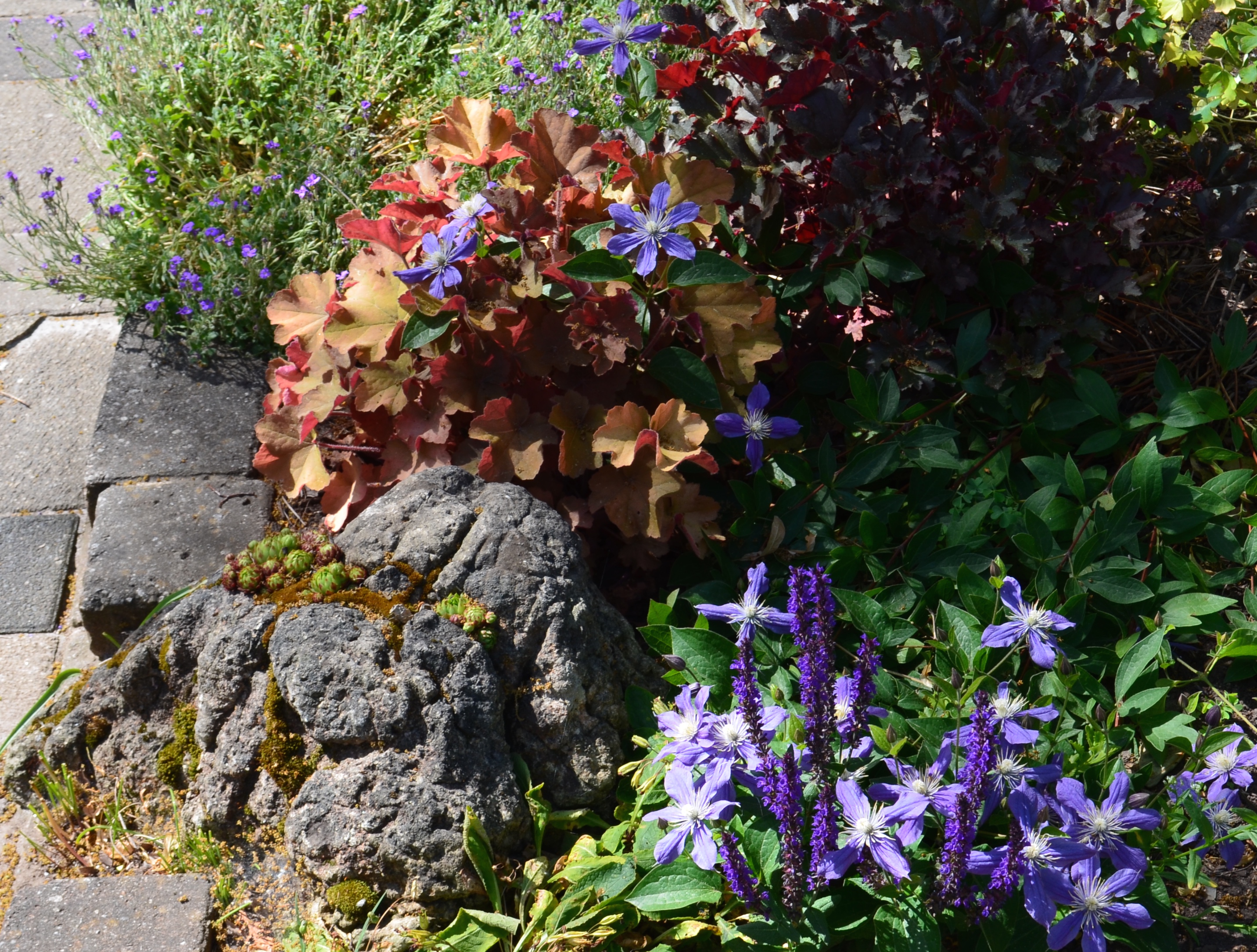 A clematis scrambling over ground covers and low herbaceous perennials can help knit a flower bed together. Shot June, 2016.