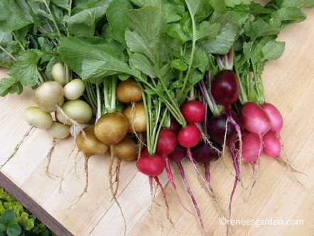 Renee’s Garden’s Garden Party Five Color Radish Mix grows from seed (planted in early spring or fall) to crunchy scrumptiousness in under a month.
