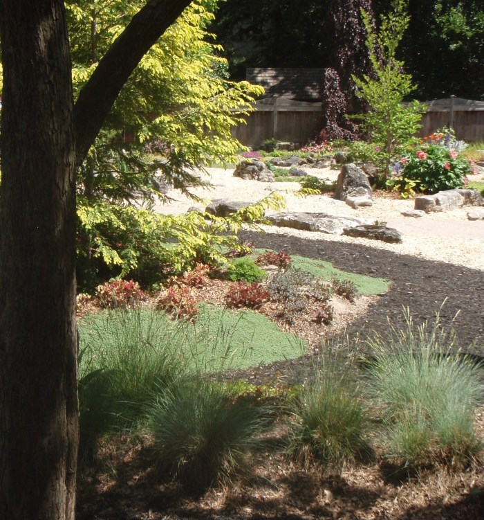 If the path needs to get you from A to B but chances are you won’t have your arms full of stuff and you’re ok with slowing down a bit, you can always plant something large and immovable directly in the line of desire such as a tree or pond or an island plant bed.