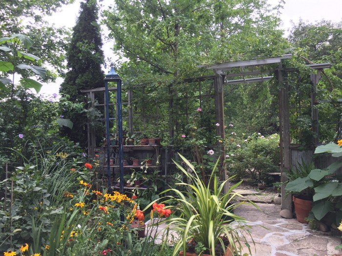 Take the example, below, at Keppel Croft Gardens in Big Bay, Ontario, one of my favourite gardens in this part of the world. I don’t know for sure what came first, the trees or the path, but my guess is that this dense grouping of large trees has been there a long, long time. Those trees essentially create a barrier that separates the gardeners’ home, on the far side, from a series of lower gardens (where I’m standing to take the photo). That this path leads directly from the house, through the trees, past a series of side gardens to a large parking lot can’t be a coincidence.