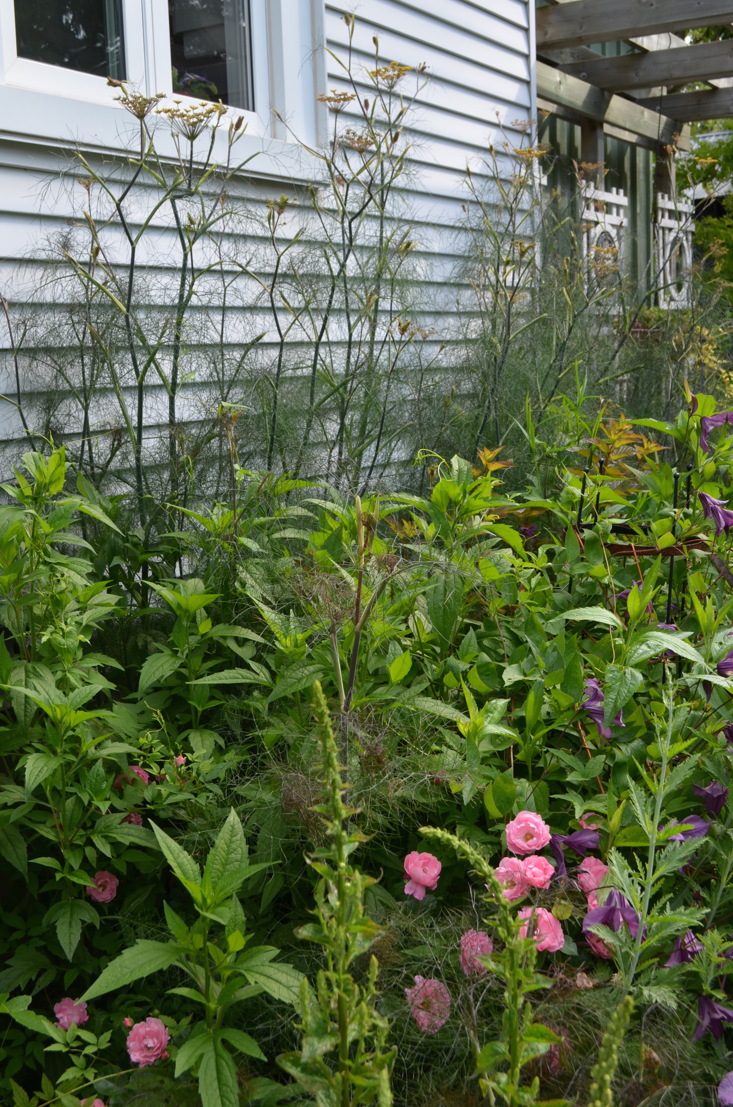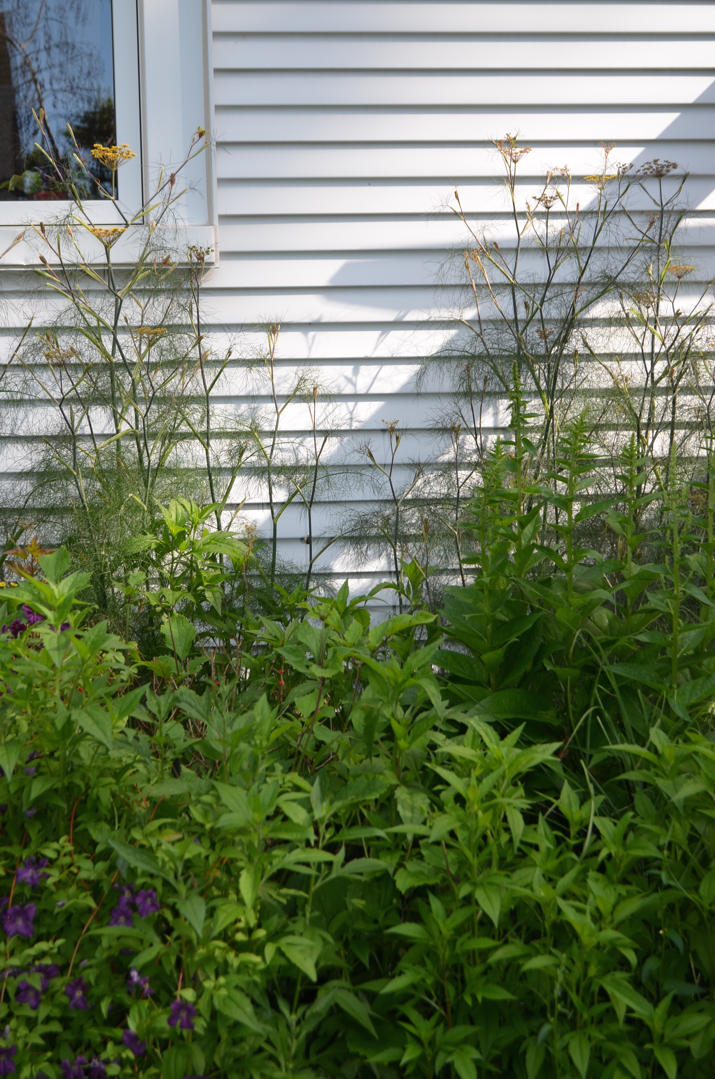 Another wonderful vegetable that bolts to great heights of beauty is fennel. Grown as an ornamental in a deep flower bed (see below), fennel works wonders to add hight and colour at the back of the border. The plants size and feathery leaves make it a wonderful addition to a melange of grasses in a large border, as well.